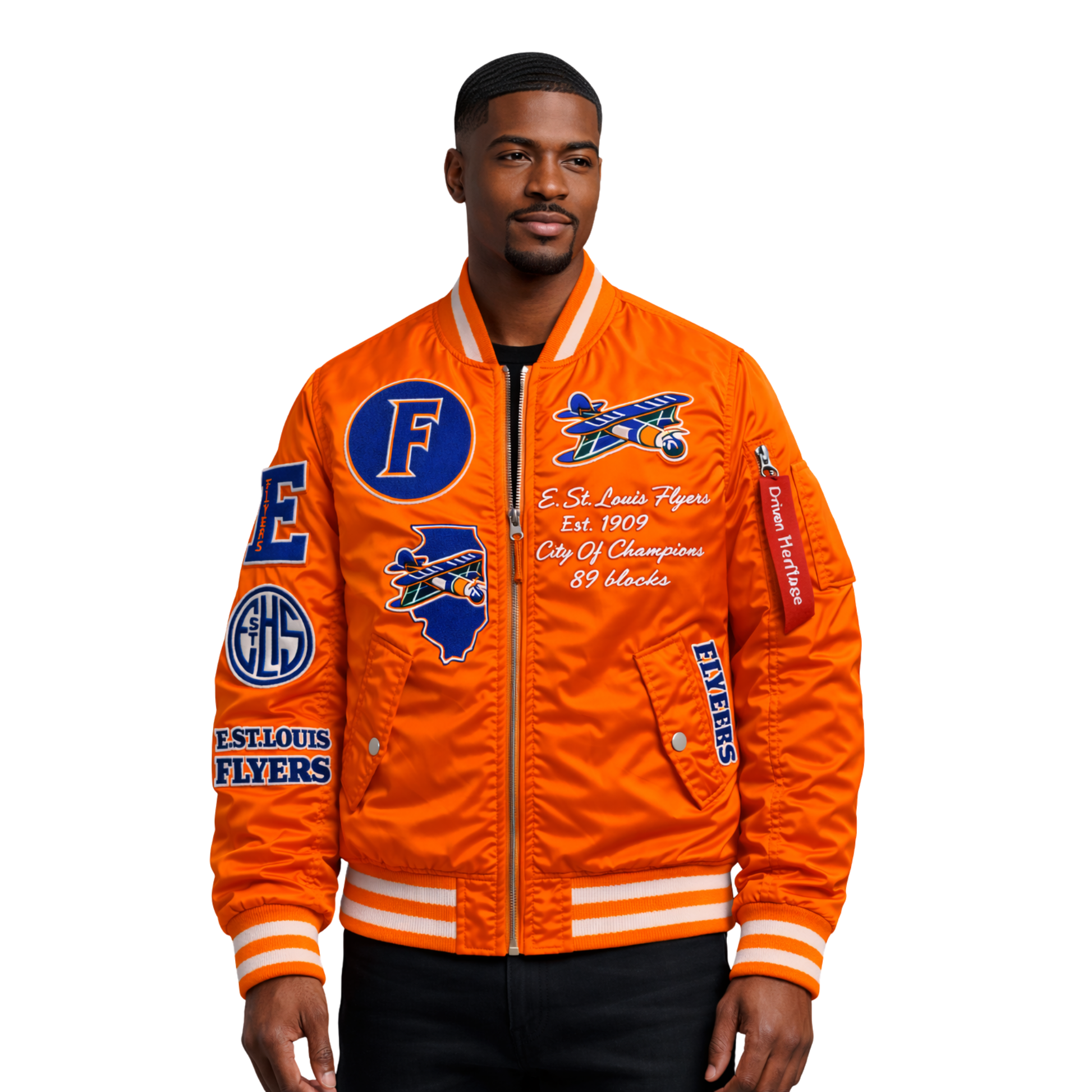 City Built is a statement of origin and preparation. This men’s satin bomber reflects East St. Louis resilience — forged through discipline, pressure, and pride. Flyers basketball energy, translated into a jacket that carries weight on and off the court.